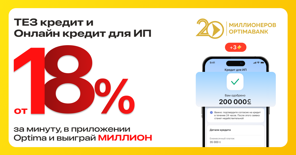Оптима Банк точно знает, что нужно своим клиентам, и предлагает Онлайн кредит для ИП и ТЕЗ кредит(онлайн/в офисе) на выгодных условиях: